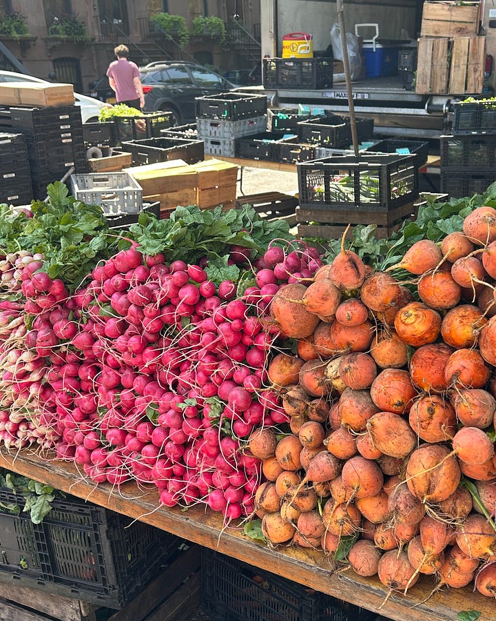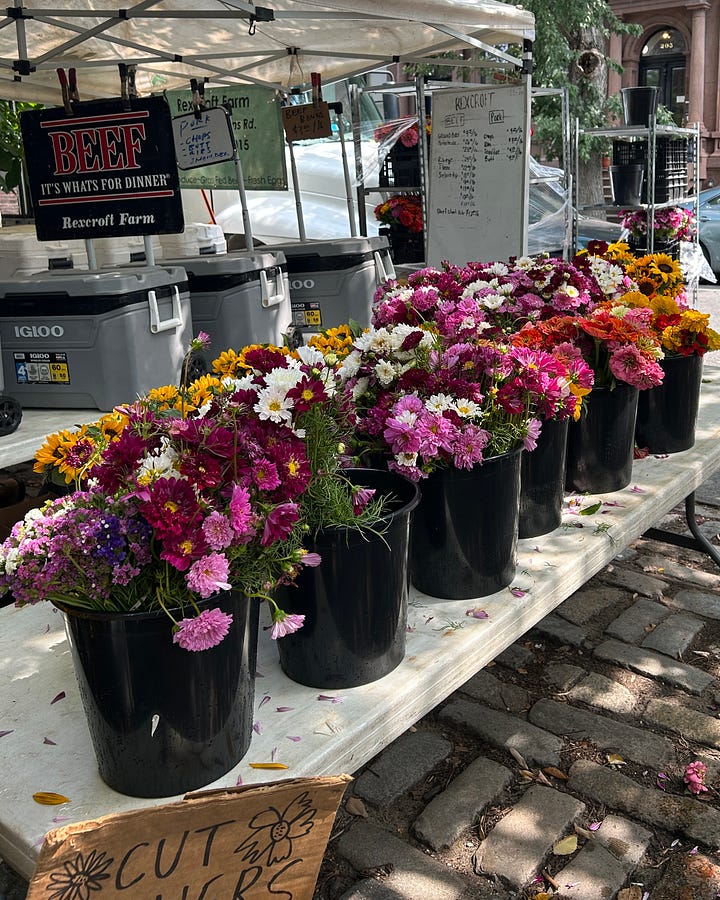Welcome to the Fort Greene Farmers Market. Let us show you around. There are in-season stone fruits, snappy radishes, excellent Hudson Valley pork chops, union-approved sourdough loaves, delightful GF, DF treats, pickles made in Coney Island, Portuguese Egg Tarts, freshly brewed coffee, vintage clothes from a neighbor's closet, sunglasses, non-GMO pet treats, and raku-glazed mugs. And, what’s that over there? Free ring sizing and real estate tips? This is the new farmers market.